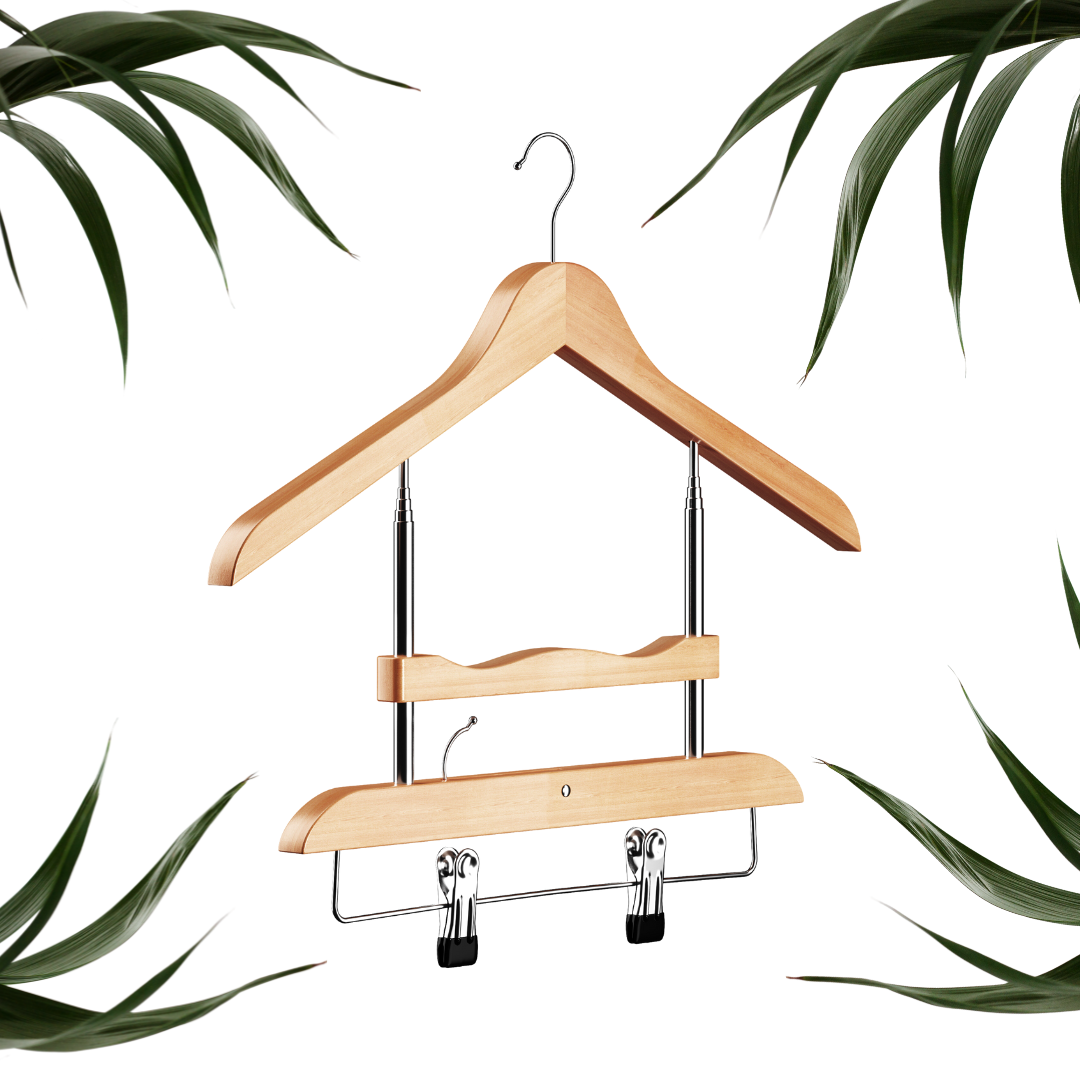 Our patented design makes the outfit hanger simple; by marrying the traditional top and trouser hanger together via collapsible rods, you can adjust your clothing size with ease.